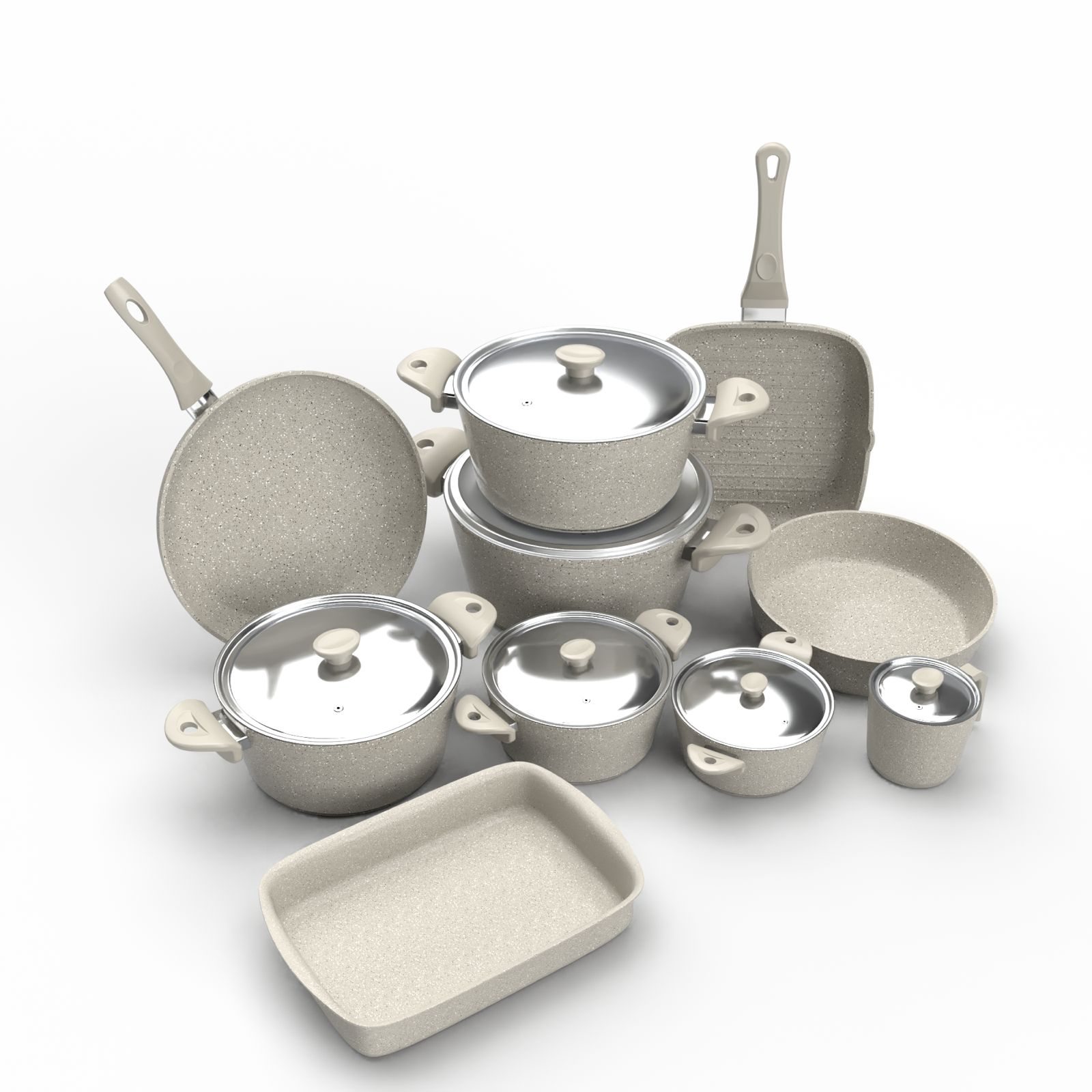 - ألومنيوم بسمك ٤.٢ مم: المواد المستخدمة في تصنيع الأطقم هي ألومنيوم عالي الجودة بسمك ٤.٢ مم، مما يضمن توزيعًا مثاليًا للحرارة ويقلل من الوقت اللازم للطهي، مما يساهم في الحفاظ على مذاق الطعام بشكل مثالي.